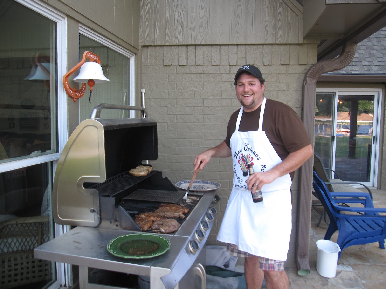 Luke took charge of the steaks.. and me and Taylor’s salmon 🙂  Jeff traveled to NOLA for work and brought each of us an apron- handing them out and requiring that if we were cooking we were wearing them.  Fine by me!