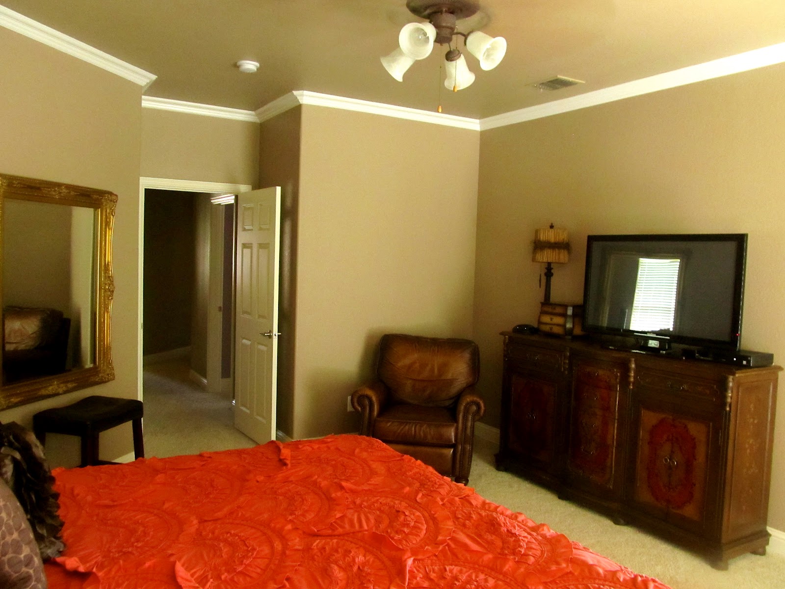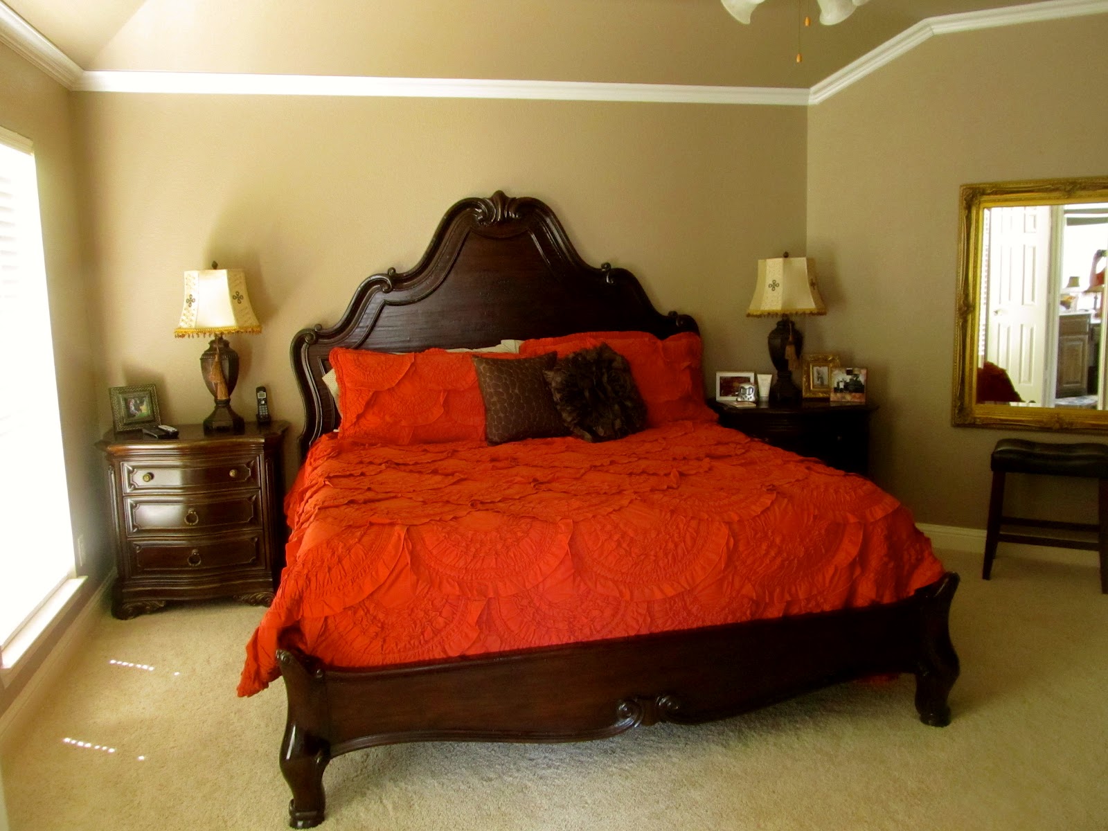 The woman that sold the house to us left that large mirror for our keeping. I plan to go over the frame with a darker stain for a little more bronze and less gold. But for now, it works. I love to have the large mirror in our room! Gotta check myself, you know;)