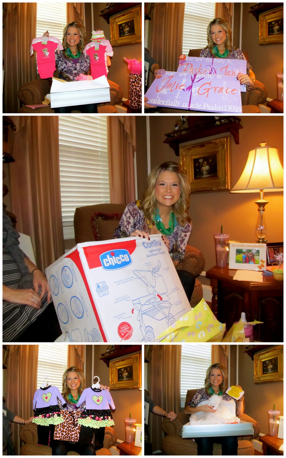 After food, the gifts came next. I was lost in a sea of baby girl clothes! Our little bits are going to be dressed so cute:) BB (Bree) finally revealed all the head bows she has been hard at work on. I LOVE them all. I sure hope she isn’t done with these babies’ heads yet. I keep telling her she needs to open a shop on etsy..