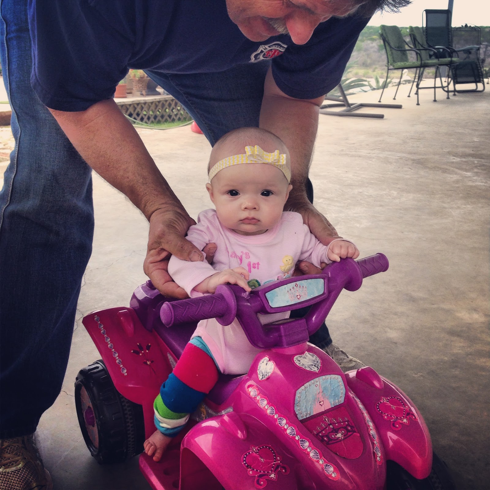 I was snuggling with Jolie on the porch when I looked over and saw her Poppa putting her on the Barbie car. I had to snap a picture:)