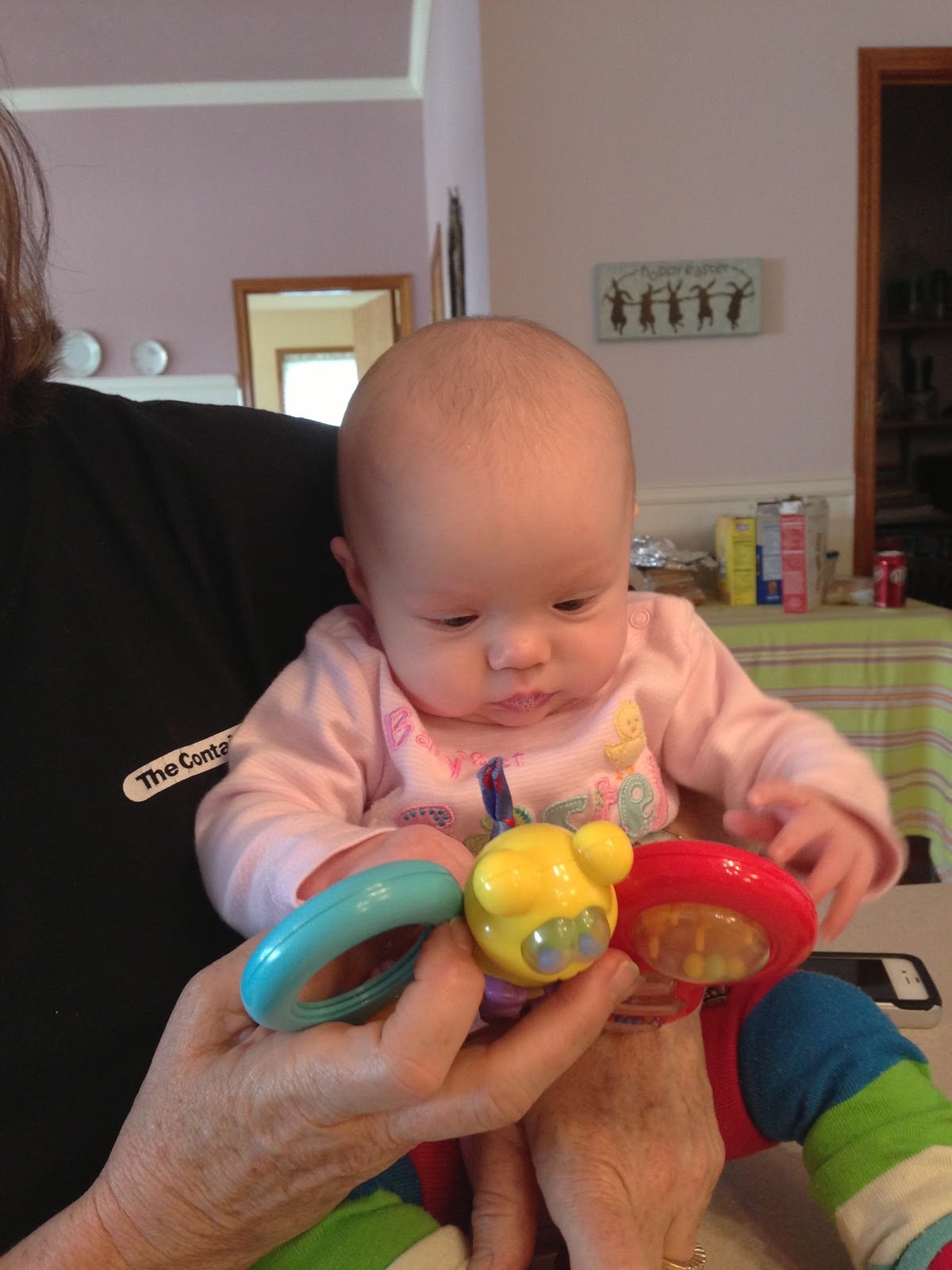 More milestones.. actual play and interaction with sensory toys and rattles. Parker and Jolie were totally into this particular toy and I nearly stuffed it in my bag to bring home with me:)