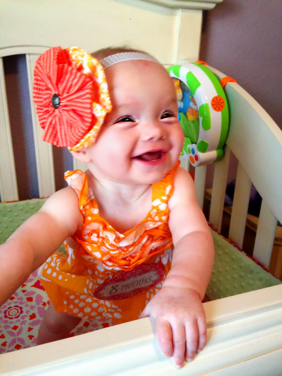 You and your sister have really hit it off to be great friends this month, and even though you are much smaller than Parker, you are not afraid to pick on her one bit. Stealing of toys and pacifiers, catching a ride on her back while she is crawling past you, or attempting to pull up with the unwilling help of Parker- you can practically drive that girl bonkers. You never cease to crack a smile, and have a smirk on your face 100% of the time. That smirk is beyond cute right now, but I have a feeling I will have my hands full in your pre-teen years. Playing by yourself is perfectly fine for you, but playing you’re your momma or dad and especially your sister gets you extra excited and warrants frequent squeals and cackles of delight. You are growing by the day and I still cannot believe how far you’ve come from just 8 short months ago. My once preemie baby girl that needed much attention and care is now practically fearless and always looking to get into something. Even when you aren’t feeling 100%, it makes me so happy to see your beaming little grin. You look more and more like your daddy every day. Each morning when you wake up, daddy brings you into the bathroom while I’m getting ready for work and I can’t help but voice the fact that you are spitting image of the amazing man holding you so sweetly in his arms. Each new day with you brings something to remember and I’m so thankful for your happy spirit.