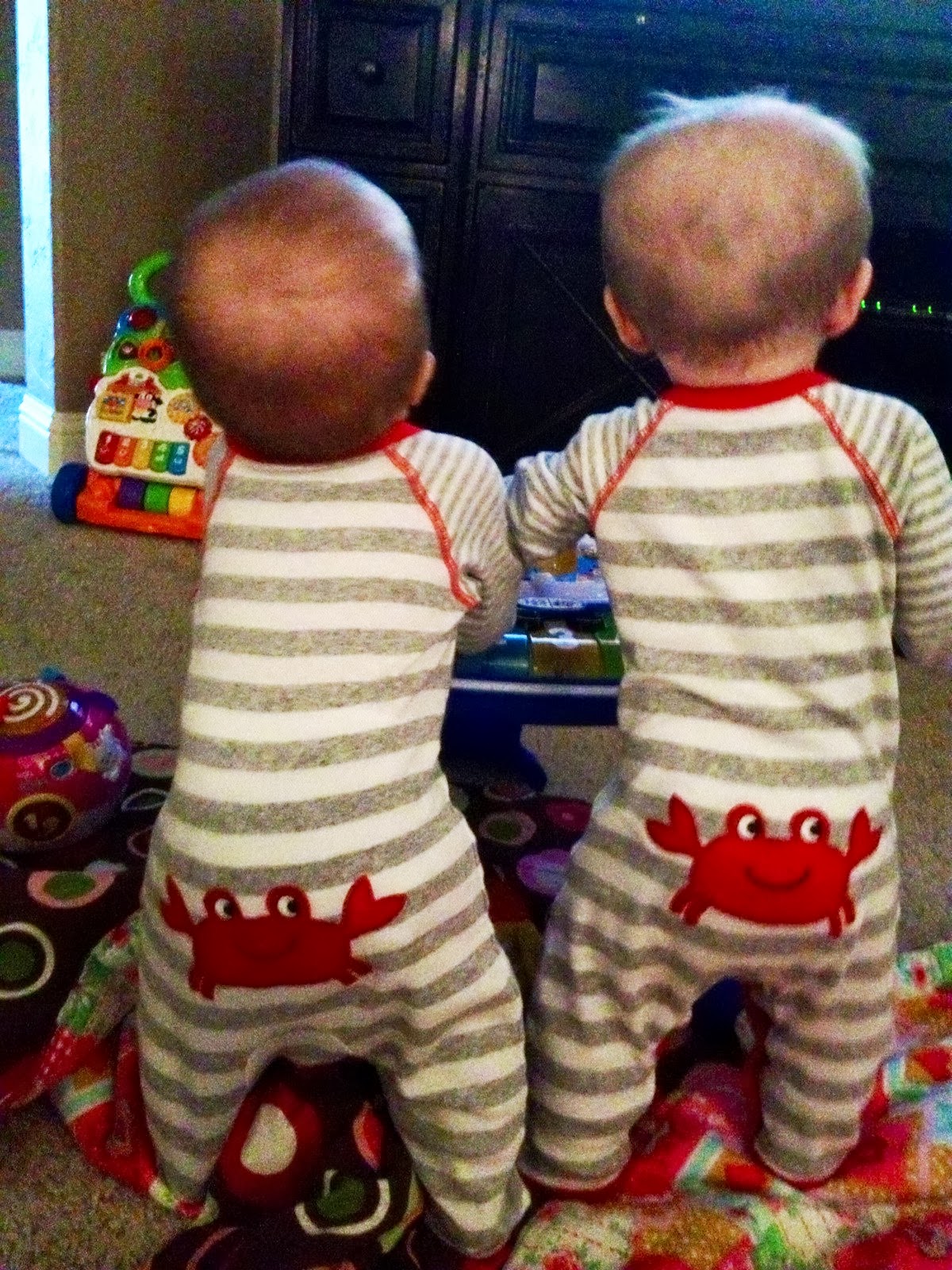 They continue to entertain each other- and as we are approaching this 8th month (still.in.shock.) it is all day long. At home, dad and I can be in mid-conversation and we will stop dead in our tracks to listen to the two of them babble away at one another. Ahhh..I totally love it- One of my absolute favorite parts about having two at this age. It’s not just me and Jordan that find it fascinating. Perfect example is at the grocery store. Jordan and I put the girls in separate shopping carts (P&J howl at the very thought of staying strapped in a car seat) and while we check out we but the front of the carts together and let these girls chat it out and keep busy. This warrants many ‘awes’ and ‘how sweet!’ from the people in front and behind us, not to mention the two or three store employees that want to see, too. I love it.
