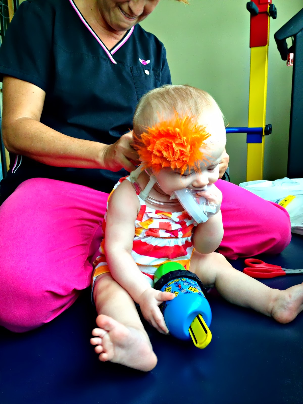 We started doing the stretching that Suzan taught us in therapy before every feeding. At that time, the girls were still eating 8 times a day, so we got a good amount of home PT in between our visits with Suzan. We went every Monday for about 2 months and finally once Jolie reached 100% range of motion we started going bi-weekly.