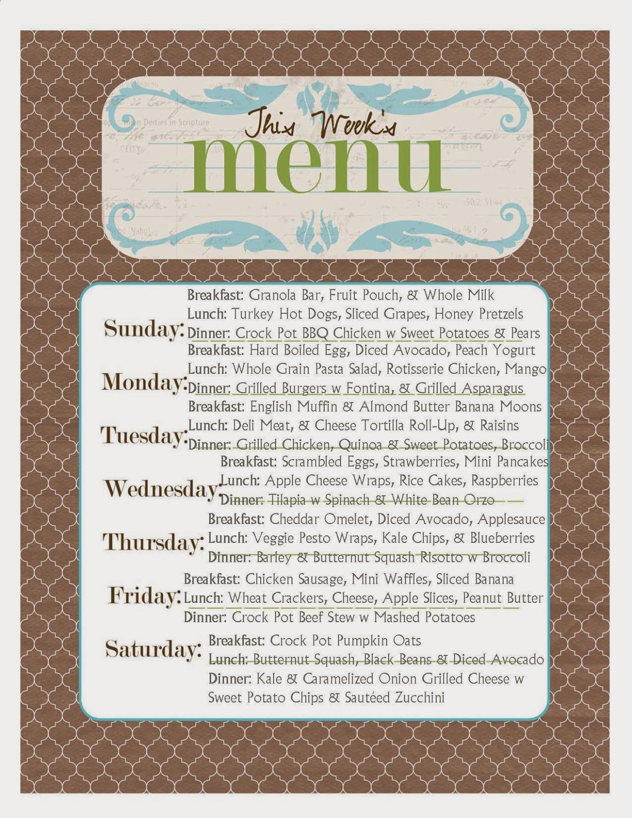 With all that being said – here is this week’s meal plan!  We are on the go a lot, and this week is no different.  I have had couple requests for more quick and portable meal ideas (lunches) for toddlers, so I’ve done my best to make all our lives easier.  I almost always.. actually I always have a cooler to carry when we are out and about for water, snacks, and meals so we aren’t making the repeat impromptu stop through the drive through.  We eat breakfast in the car a lot on the weekends, so it is most often self serving or some kind of smoothie.  Cheese and crackers, pasta salad, and turkey roll ups are a go to for lunches on the run.