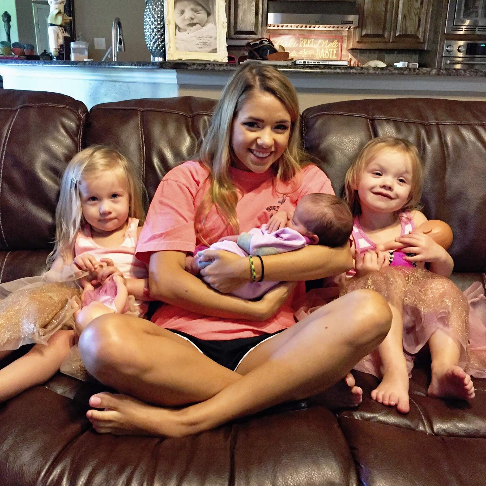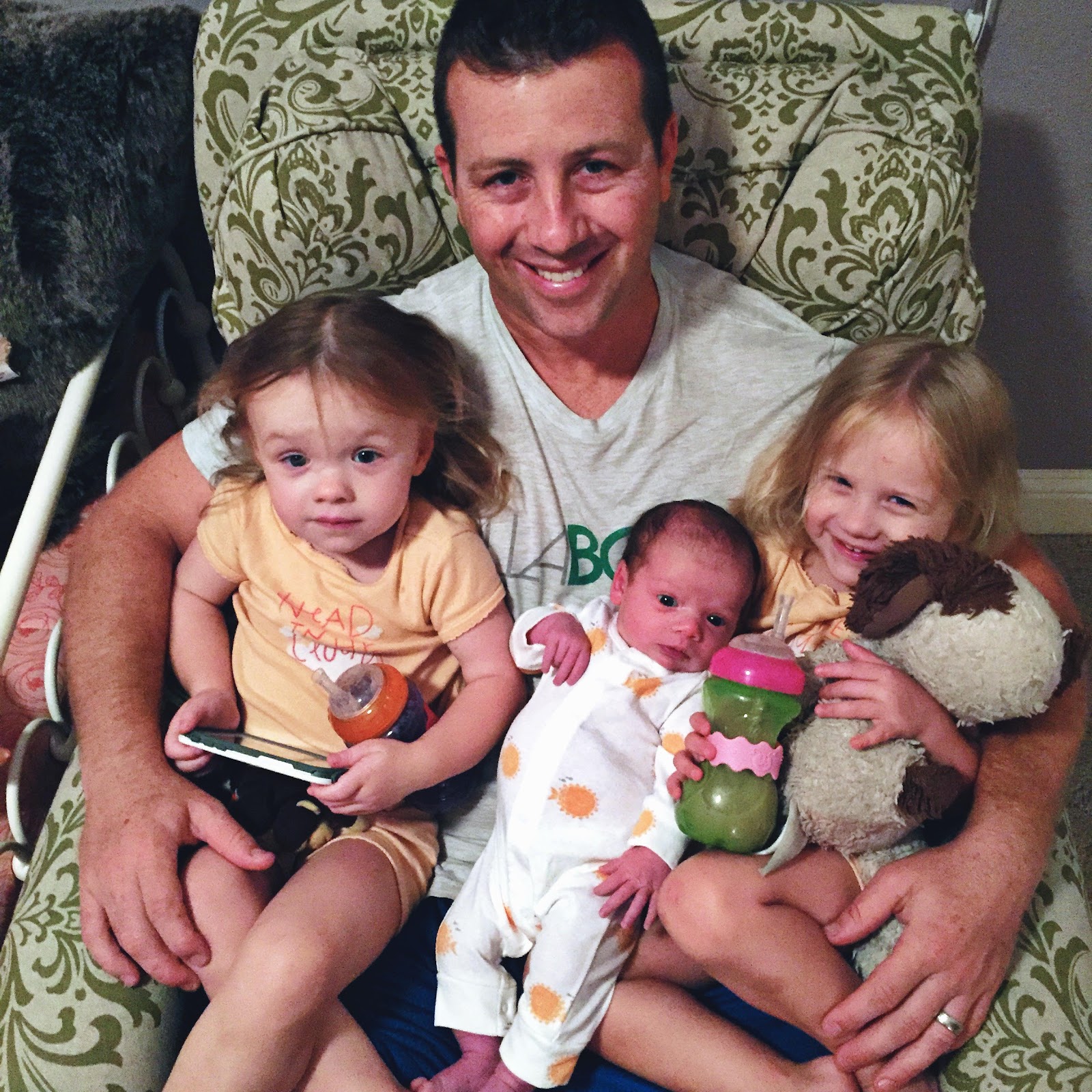 Baker is an exceptional eater! From the moment we met for skin to skin to practice just minutes after she was born she was ready – nearly a perfect latch from the get go. My milk came in on day 2 and memory hormones (as the lactation consultant called them) recalled my supply from a year and a half before in feeding two babies, so I was offering her plenty with more to spare. I ended up having to pump for relief after feeding Baker while we were in the hospital and came home with over 20 ounces of milk to store. Jordan had to make a run to Walmart to pick up a cooler for the car ride home! More on that later, but I was so glad to have a good initial experience in nursing with Baker – and thankfully after a couple days my body figured out that I was not feeding twins this time around! I was honestly nervous for how it was going to go. Sure I could feed Parker and Jolie, but was I going to be able to do it all over again for Baker? So far so good- breastfeeding has continued to go well over these last four weeks. Baker eats about every 3 hours during the day and will sleep in 4-5 hours between feedings throughout the night. This last Sunday we were out and about running errands – church, lunch, shopping.. in the car a lot and therefore Baker slept a lot and didn’t really wake to eat but about every 4+ hours. That night the girl woke every 2 hours ravenous to eat.. I’ll never make that mistake again:) I am practicing on-demand feeding still so if and when she is hungry at 2 or two and a half hours I feed her rather than wait to that 3 hour mark. This could be why she gained over a pound in just two weeks! If she happens to be awake during that last hour before its time to eat again, she’s not sure what to do with herself and will root and fuss and grunt until I feed her.