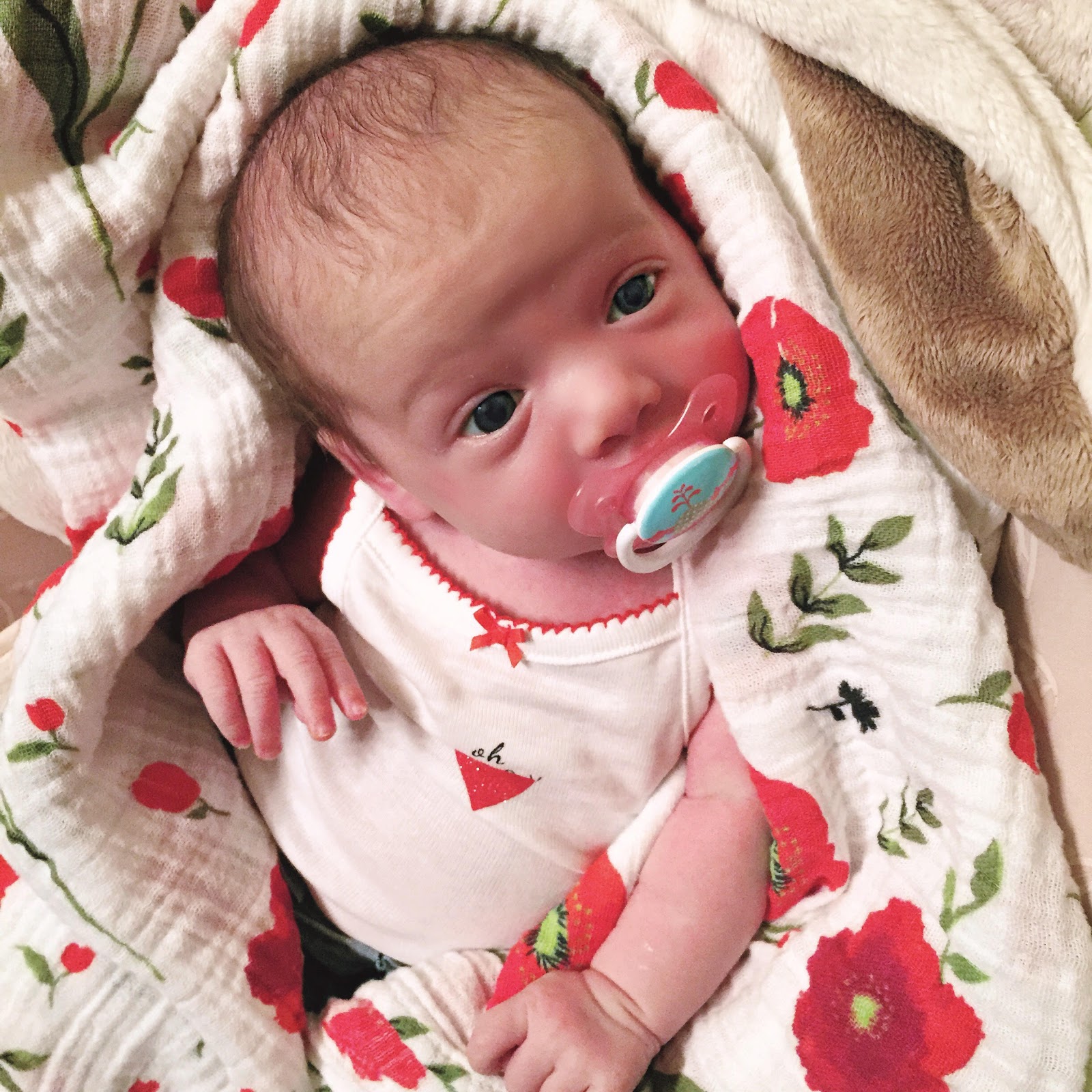 We held off on offering the paci until this last week – and she is a big fan! Its taken some work to get her to learn about what she is actually supposed to do with it, but I think we are figuring it out. Good news is that it hasn’t even phased her with nursing. No bottles just yet, but I am excited to have the girls help feed her soon (I wanted to wait until after 4 weeks and we established a good nursing routine before offering it). I am not pumping after every feeding as I did with the twins, but if I feel the need I will pump after the first feeding in the morning (when milk production peaks) or before I go to bed if Baker falls asleep and doesn’t empty. Not everyday, but 3-5 times week I will pump about 3 ounces after she nurses. I haven’t pumped due to a missed feeding yet, so I’m interested to see how much I get at that time. For the most part, Baker does a great job in emptying after nursing until she is full after 15-25 minutes on one side. She doesn’t usually want/need to nurse on the other side, which was a very new experience for me after tandem feeding the twins for 13 months. She’s all business, eats quickly (averages about 17 minutes), and rarely falls asleep until she’s done with me.