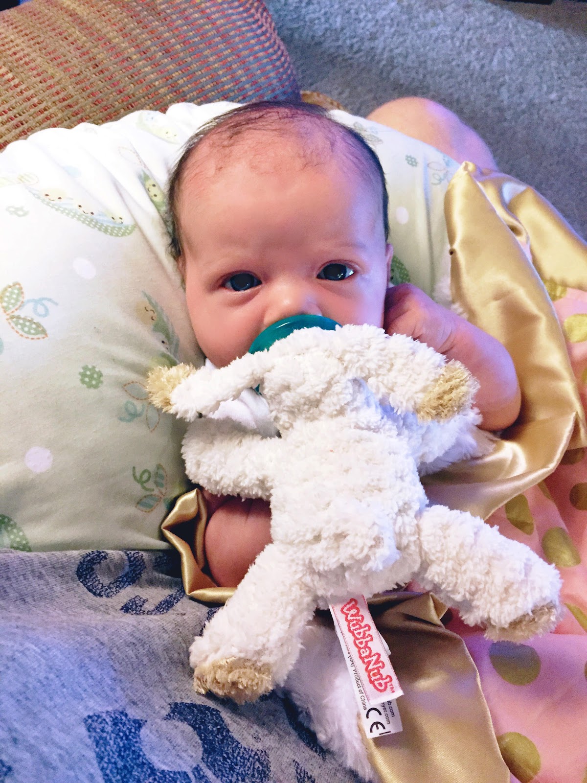 Baker found her hands this month and with that.. she also found her thumb. She switches between sucking her first two fingers and her thumb, but holy cute- I am loving it. I have a feeling she will love her wubby not for the paci, but for the bunny attached and instead of a paci, she will suck her thumb/fingers. A characteristic from each of her older sisters.