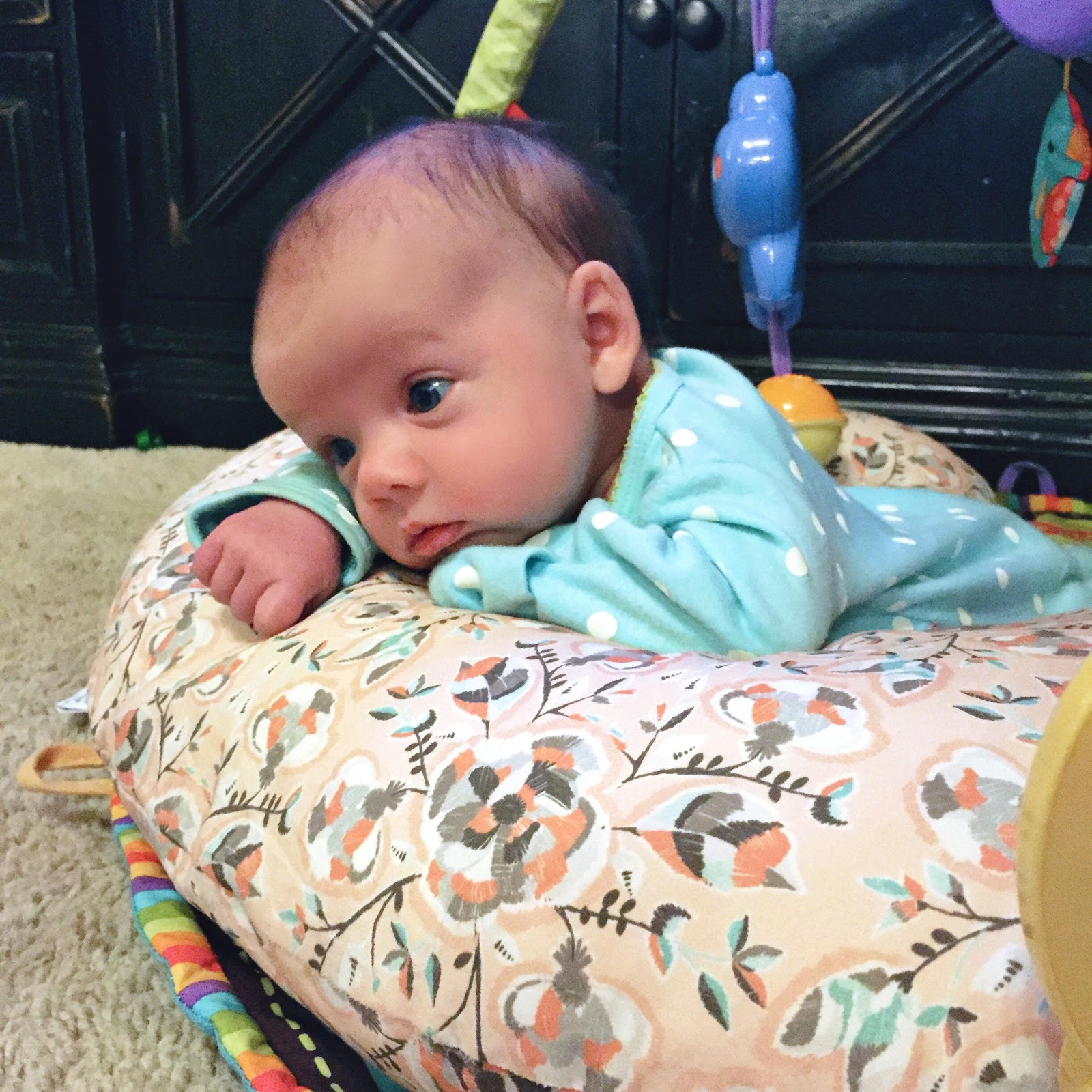 The first time she cooed out loud it almost caught me off guard. I was so impressed with her little voice.. I bounced around trying to make her talk again just so I could hear that sweet voice again! During the day, Baker really is a super enjoyable baby. If you can get her to lock eyes with you, she’s incredibly smiley and talkative -especially right after nursing. In fact, nursing is her favorite time to chat me up. If she’s not falling asleep, she’s basically flirting with me. Looking up at me and when she catches me smiling at her she will bury her face (in my boob). Such a silly game! The same silly game Jolie and I used to play. She has the sweetest, raspy little voice! She also likes to complain a bit now too – Its not a cry.. its more of a continuous monotone whale and it is SO funny. Tummy time is the perfect example of this ‘complaining’. It is probably her least favorite thing to do. She’s great at lifting her head when we are holding her but overall during tummy time she tends to just relax with her head on the Boppy.