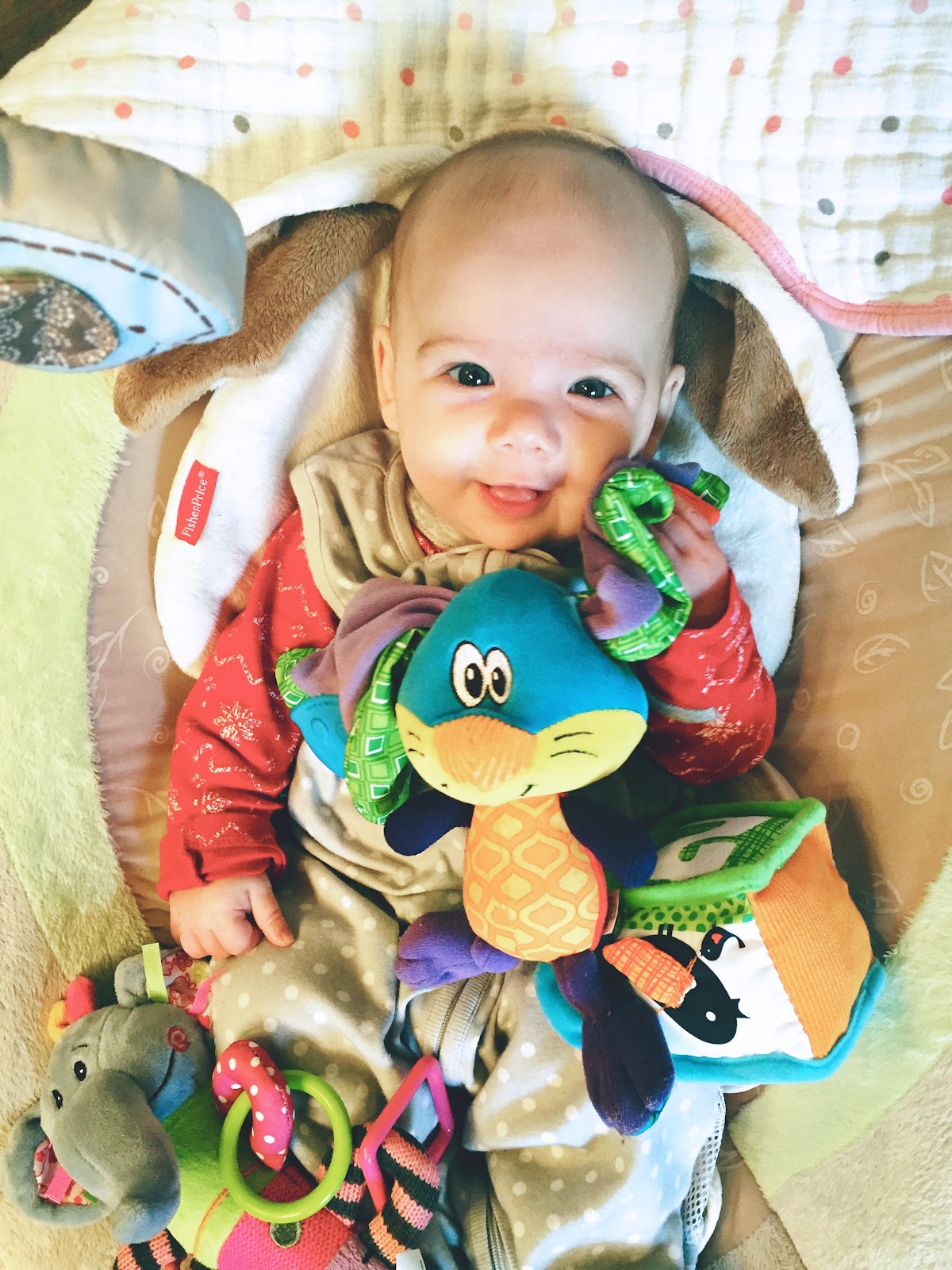 You have found your feet/toes and they are your most favorite ‘toy’ on this planet. You can lay in a pile of rattles, stuffed animals, squeaky toys, and light up activity- but be completely content with your little feet. In fact, you are pretty content with most things. You will play by yourself for 20-30 minutes, babbling to your toys or playing with your feet. A few weeks ago you finally mastered the back-to-tummy roll and now want nothing to do with laying on your back for play time. As soon as we lay you down you are already busy maneuvering your way to your tummy to grab everything within arms reach- and then of course put it in your mouth.