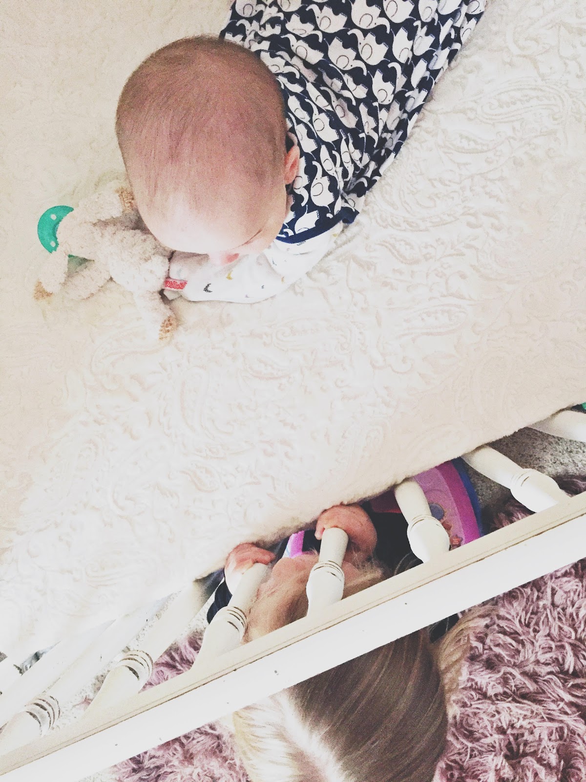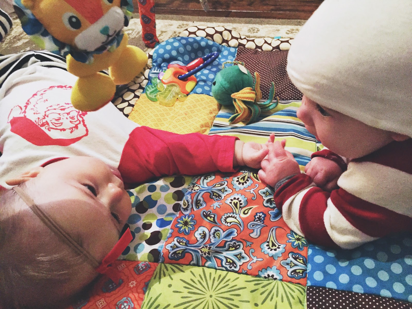 This girl LOVES to play. A few weeks ago we pulled out the exersaucer toy just to see if she would be able to fit and play.. and um, not only did she fit- but she plays her little heart out in it! She loves the lights, the sounds, and the fact that she can stand on her own to play. Her favorite thing to do is stand on her little legs. If not standing, she’s kicking or grabbing her toes – she LOVES her feet! She is fascinated with them! While she found them last month, she has really made them into a toy this month. Her interaction with her sisters and her little baby friends has become more controlled. Reaching for toys and playing contently. She will sit in her bouncy seat or on the playmate and play and explore her surroundings for 20 and up to 30 minutes! I have gotten good at getting the kitchen straightened up and a load of laundry in the wash while she gives me that time. While she isn’t quiet fine with playing alone, Parker and Jolie are always close by:)