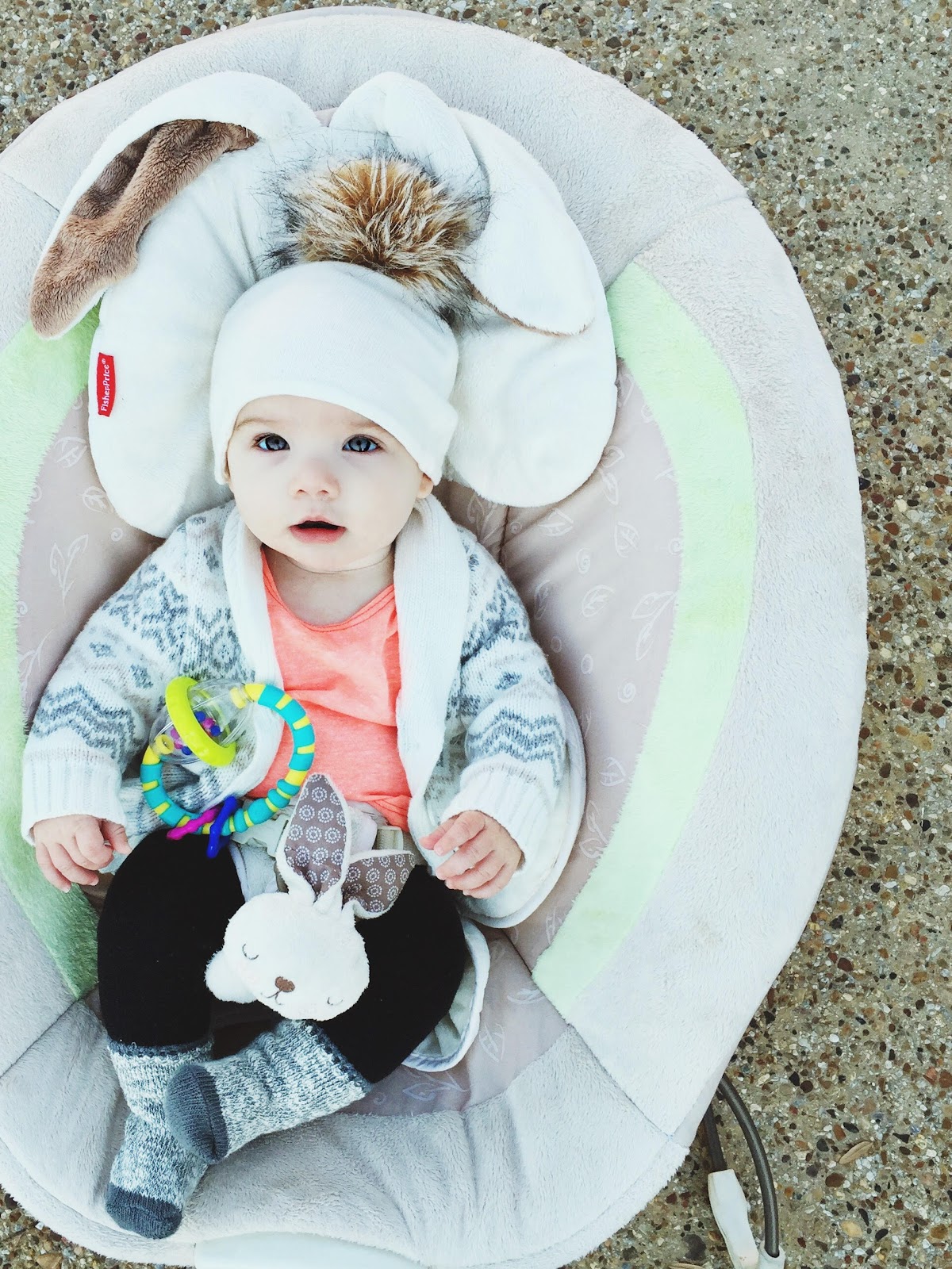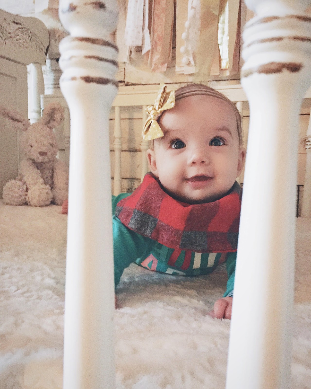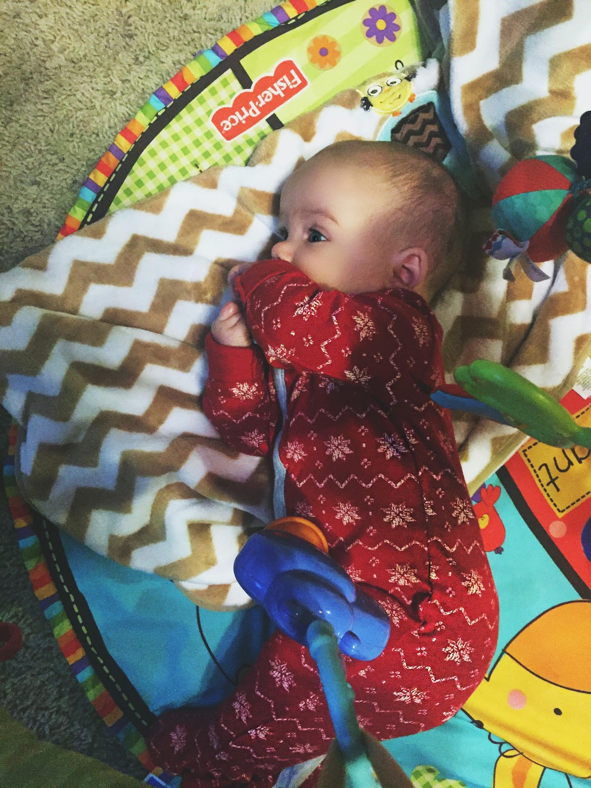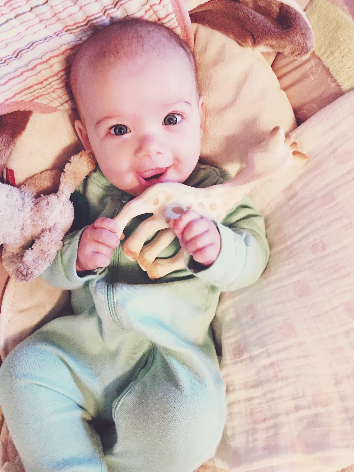 She rolled over from back to tummy this month! Since she mastered this roll she rarely stays put on her back for long. If I lay her down she flips right over almost immediately. This is making diaper changes fun! For the most part everything goes straight to her mouth- we have a few favorite toys, and love basically anything that makes noise! If it doesnt make noise, she is slapping it on the counter or table or even on herself. She had really taken a liking to one of her bunnies- she rubs its ears on her face when she sleepy. I was hoping that she would start favoring a toy or a ‘lovey’ at some point.. her sisters did and still have their little loves (Wubby and Puppy) they sleep with and basically bring everywhere