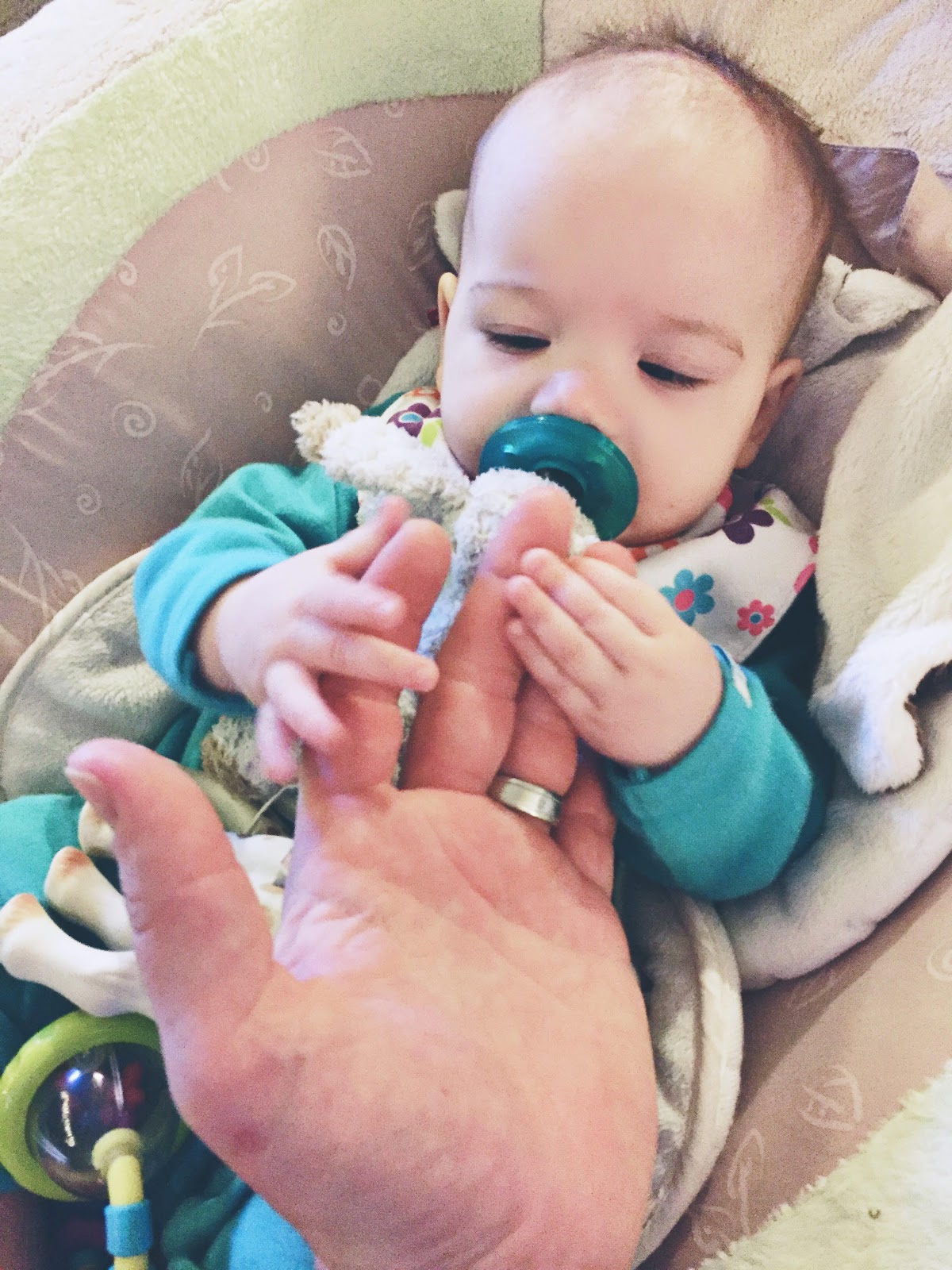 LOVES her paci! When she became congested early last month she couldn’t self soothe or suck on her thumb (and stopped sleeping through the night..) so we started offering her wubby a little more and a little more and she now prefers it over her thumb.