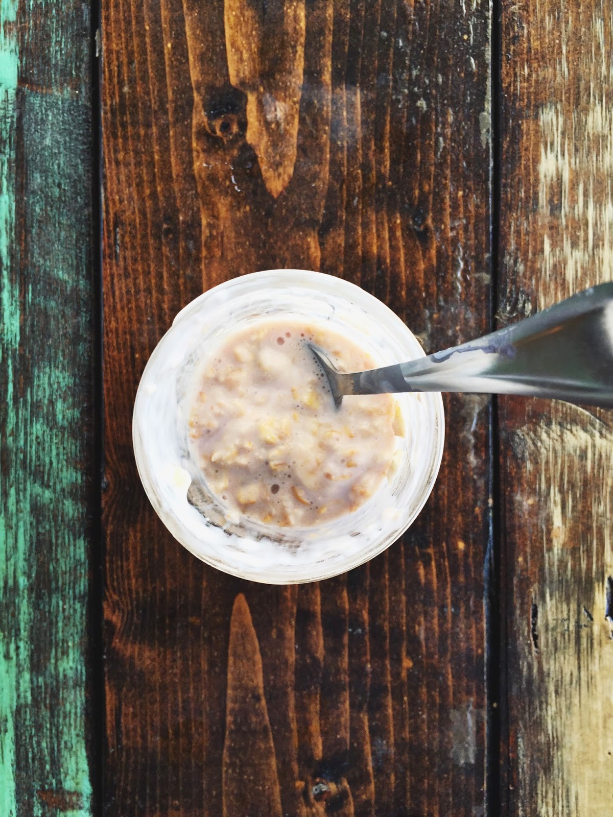 greek yogurt + oats + almond butter + skim milk + chia seeds
