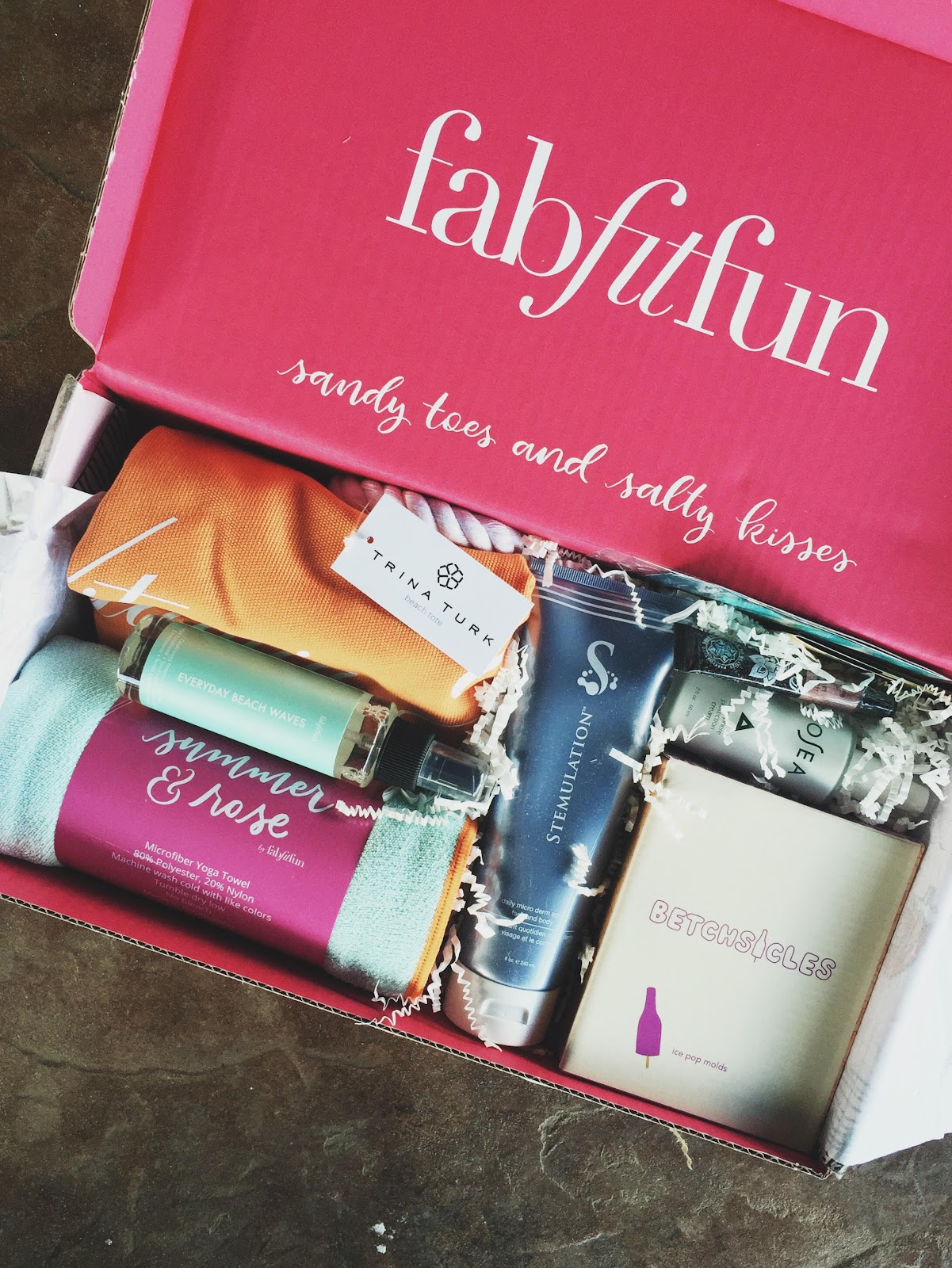 I got my first FabFitFun box in the mail this week! I had seen these super cute boxes land on the doorsteps of a handful of celeb peeps I follow and I was so excited to try it out! fabfitfun is a subscription box company that offers full sized lifestyle, fitness and beauty products- which is totally up my alley right now! when I tore into this month’s summer box I was so excited for every little thing! I used the yoga towel today at workout and because the humidity my mat gets slippery so the towel was perfect to lay on! the beach bag is AMAZING and huge. perfect for toting 4 different kinds of sunscreen and about eleven barbies to the pool. beach waves spray + osea moisturizer, full bod scrub!