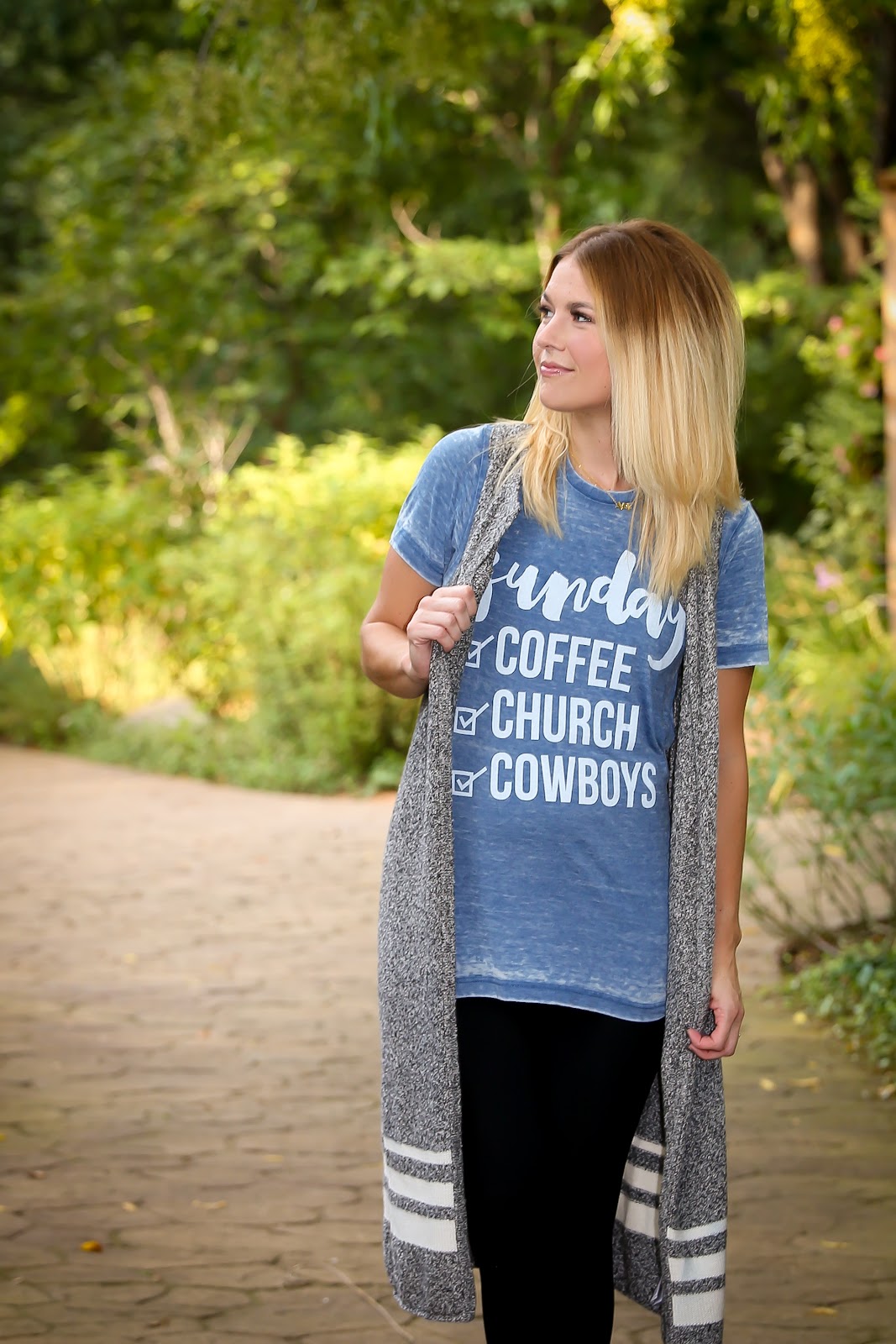 who is ready for some football?! preseason is over and we officially have football on the television every sunday for the day’s entirety. AND this will basically be my sunday attire. comfy leggings, a flowy cardigan and my sunday checklist tee. I for one love love looooove the cool weather. I would much rather it be cold so I can layer layer layerrrr. I basically wear a sweatshirt and pants through the entire Texas summer (indoors), so being able to be that comfortable outside of the house is optimal for me:)
