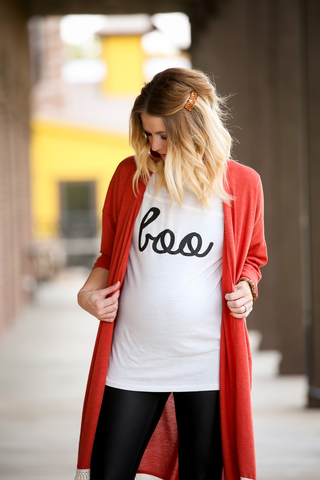 Swooning over that orange cardigan,and the "roushing" (sp?) on the side of the top makes it look so flattering and adorable!Love the outfit inspo even for non maternity 🙂