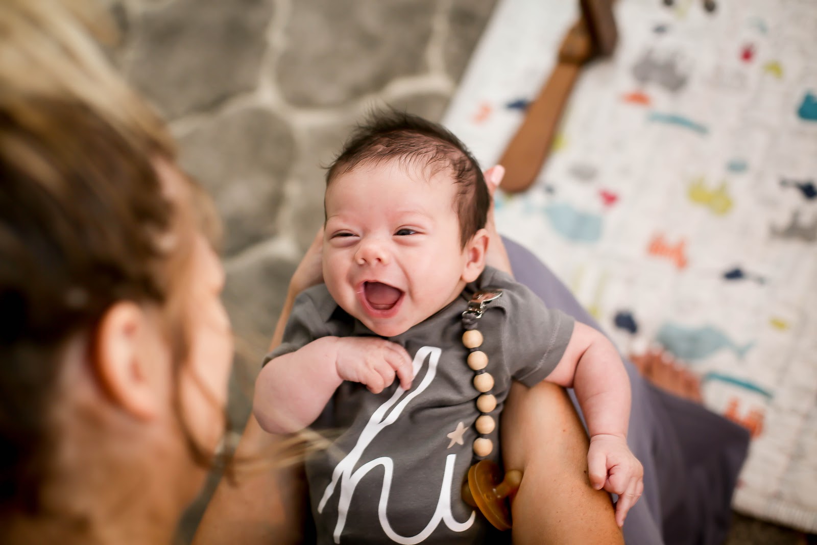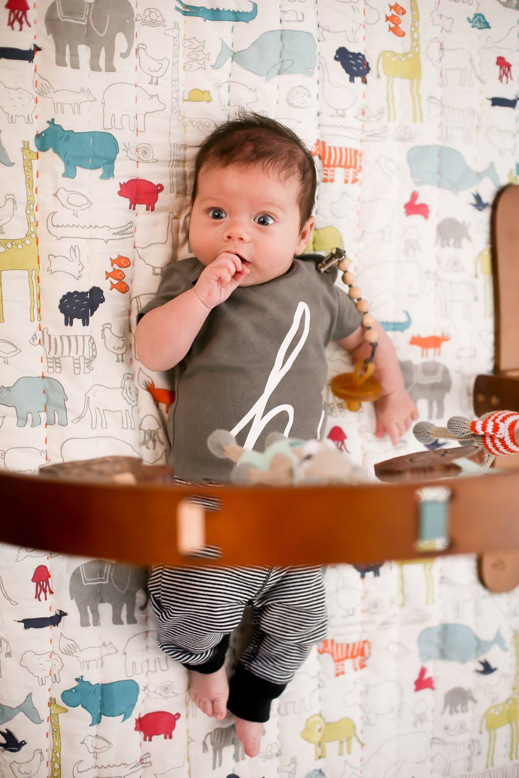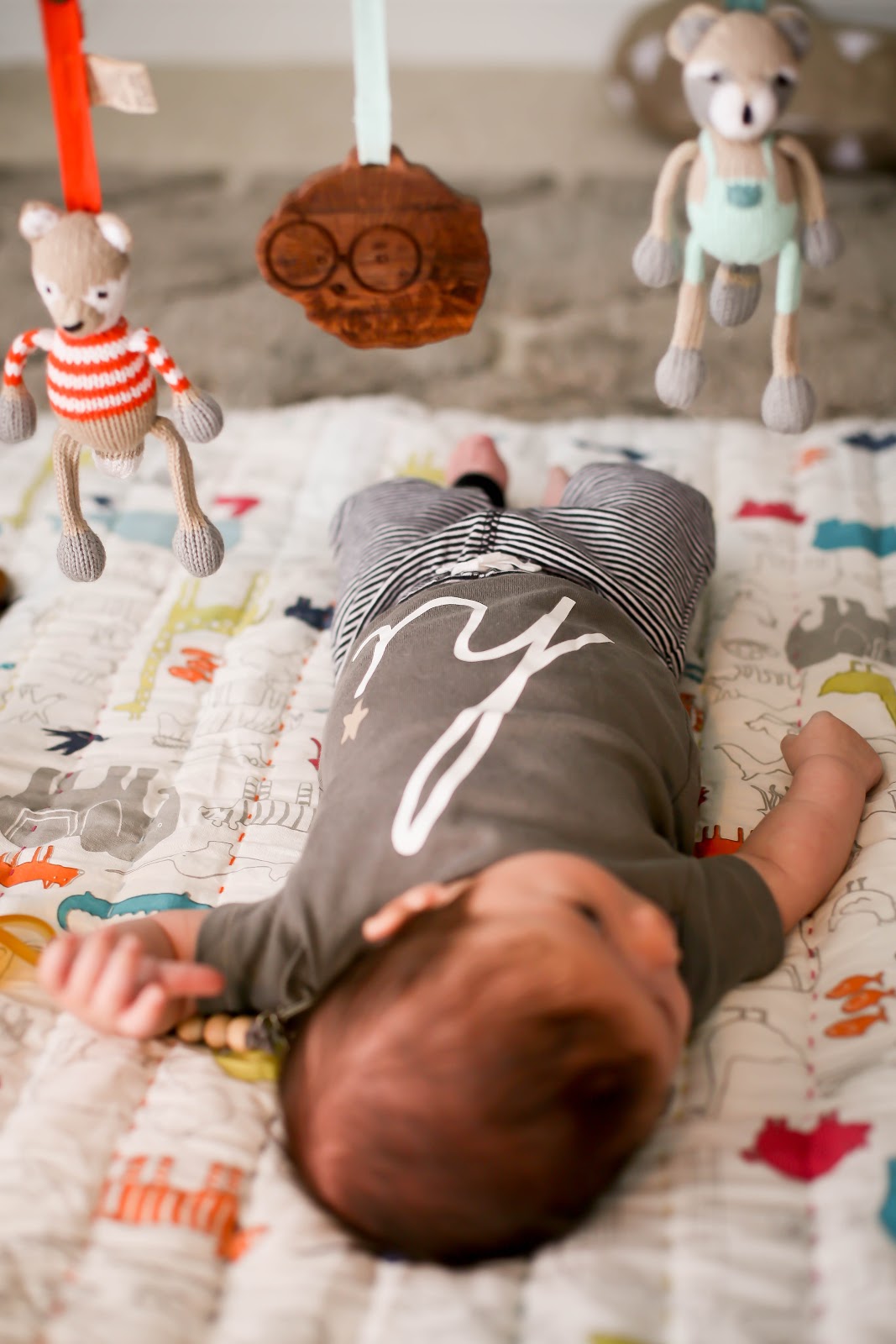 I stocked up on all the adorable newborn clothes to fill Brady’s empty drawers with visions of him wearing them soon.. and here we are with an 8 week old Brady in our arms and I cannot get enough of how precious he looks wearing these comfy clothes! he’s changing by the day and his most recent milestone is learning to play and interact with all of us- his little voice is just the sweetest! and he’s growing like a weed- I mean.. where did those cheeks come from?! time if flying and snapping these memories of my fourth baby’s first play time on a quilt under his little play gym will be something I won’t forget. I have pictures of all four of my kiddos playing like this and wearing a Carter’s sleep and play or onesie..